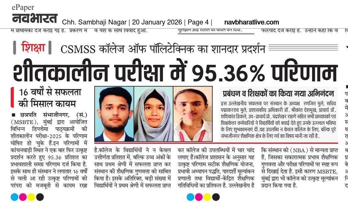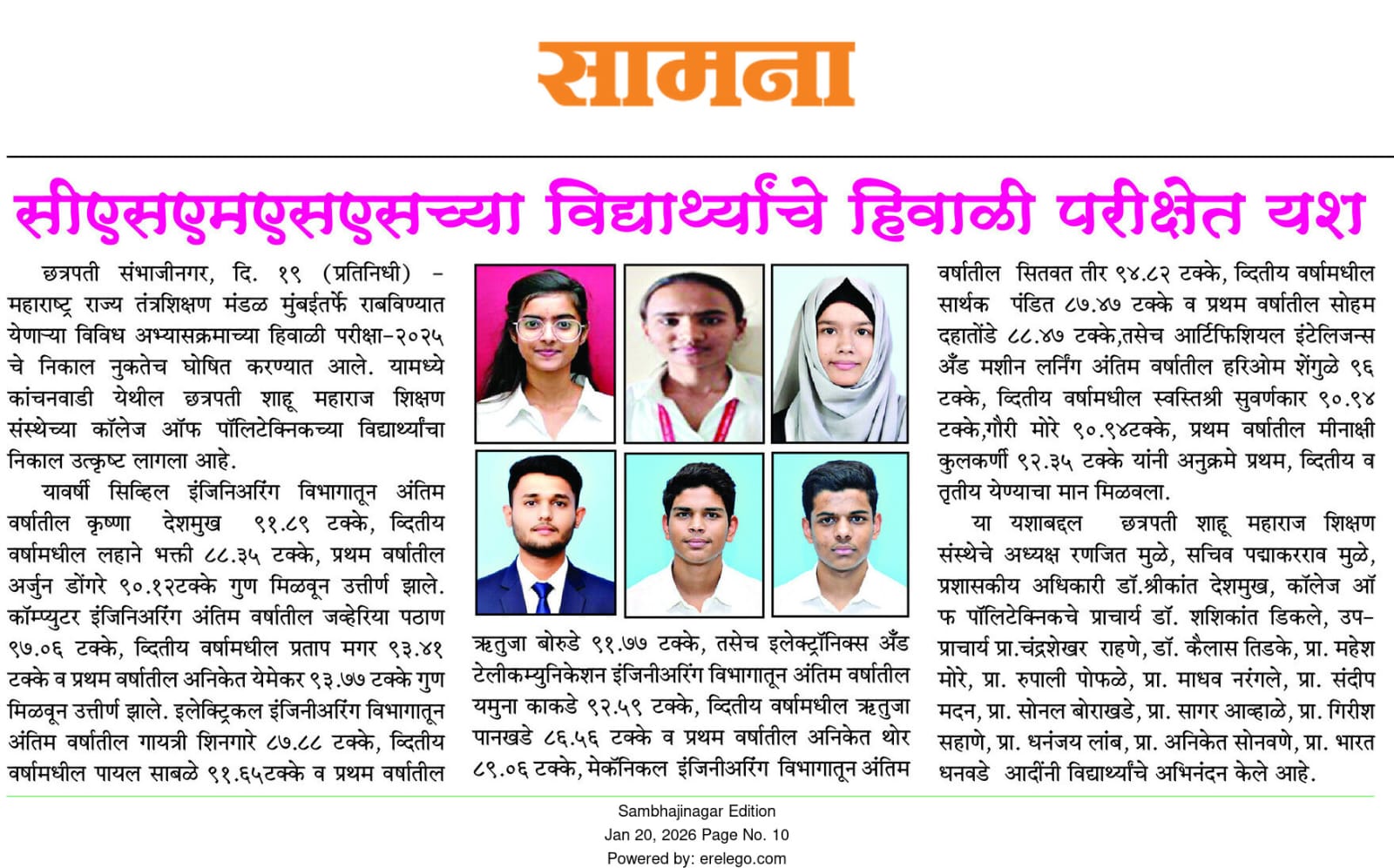 सीएसएमएसएस कॉलेज ऑफ पॉलिटेक्निकने राखली निकालाची उज्वल परंपरा